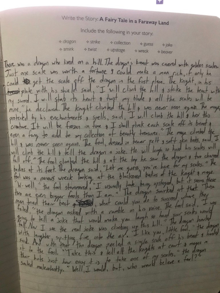 The fool, dressed in beaver pelt and soft skin boots said, “I will climb the hill and tell the dragon a joke. He will laugh so hard his scales will fall off.” The fool climbed the hill and at the top, he saw the dragon and two charred bodies at its feet. The dragon said, “Let me guess, you’re here for my scales.” The fool was a nervous wreck looking at the blackened bodies of the knight and mage.