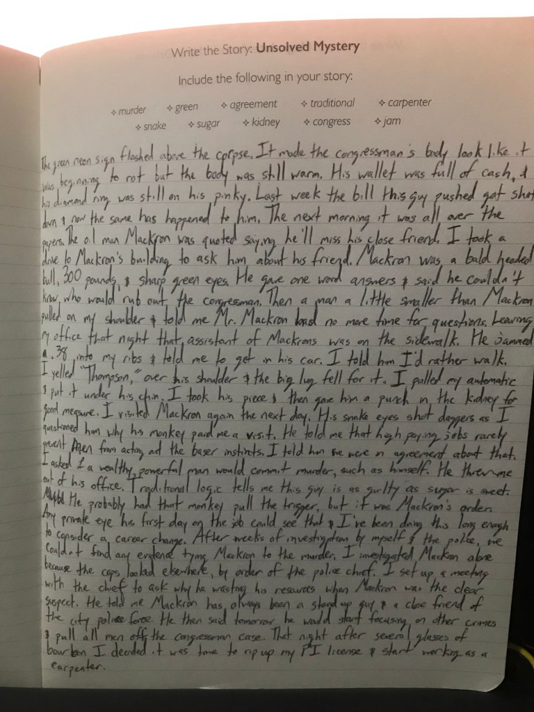 After weeks of investigation by myself and the police, we couldn’t find any evidence tying Mackron to the murder. I investigated Mackron alone because the cops looked elsewhere, by order of the police chief. I set up a meeting with the chief to ask why he was waisting his resources when Mackron was the clear suspect. He told me Mackron has always been a stand up guy and a close friend of the city police force. He then said tomorrow he would start focusing on other crimes and pull all men off the congressman case. That night after several glasses of bourbon, I decided it was time to rip up my P.I. license and start working as a carpenter.